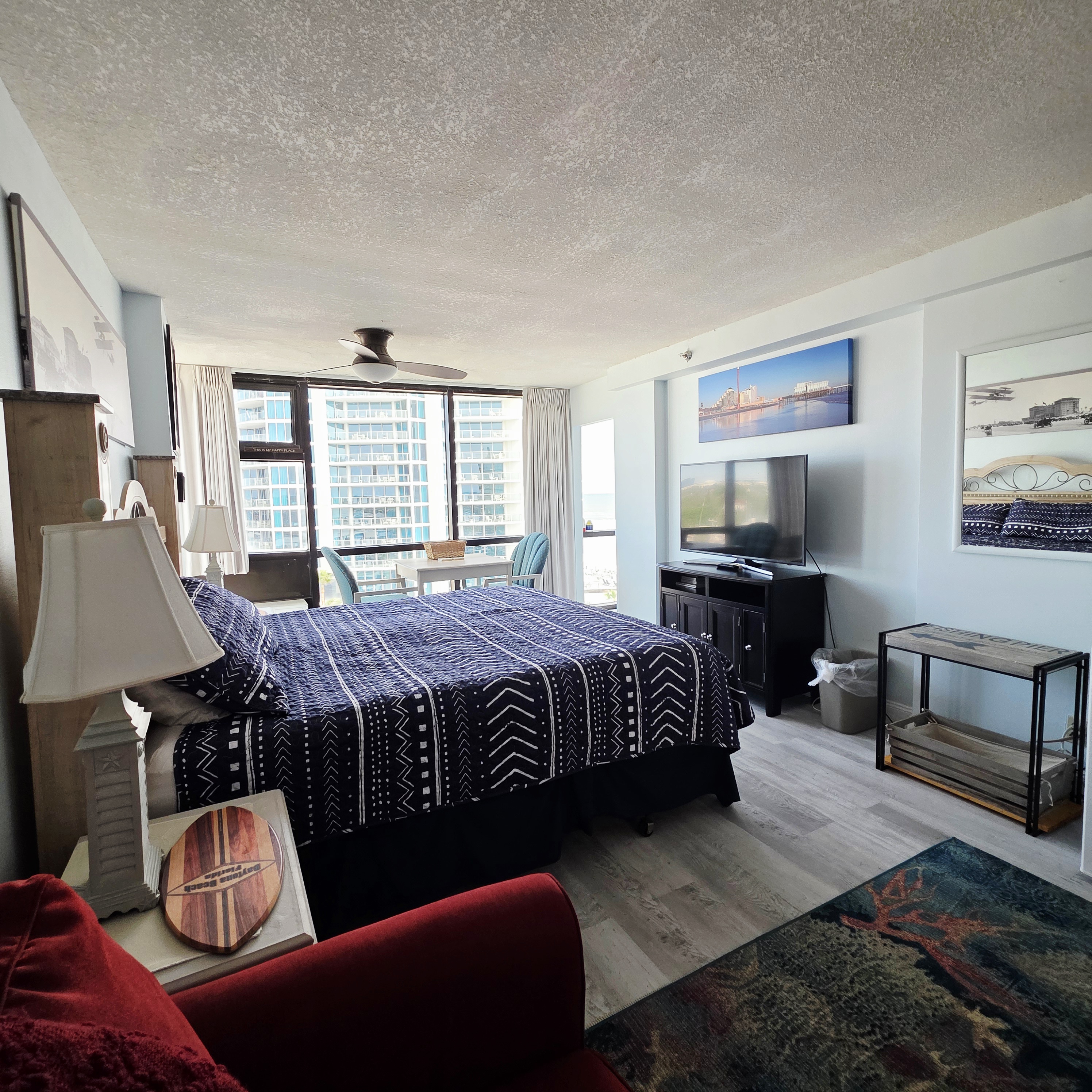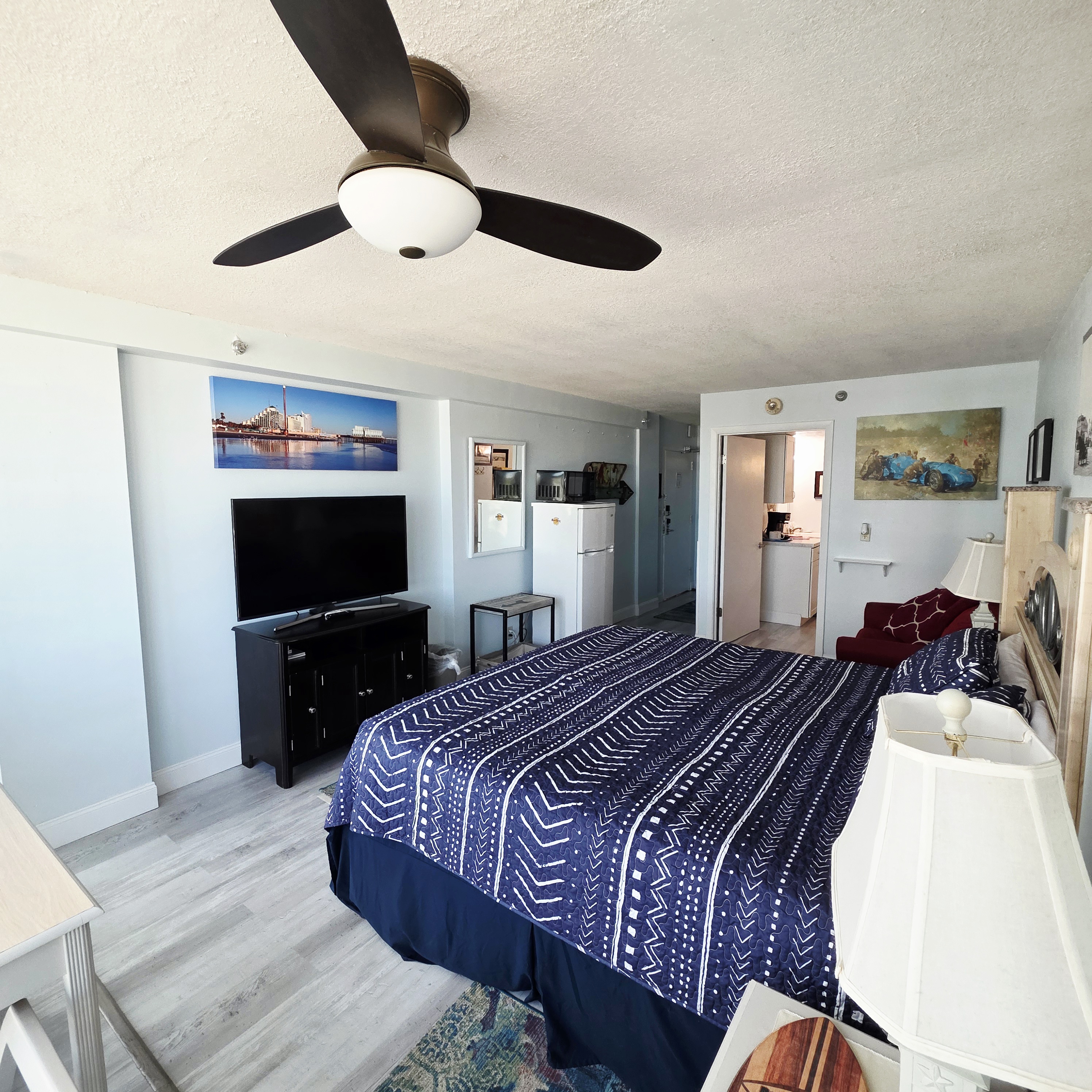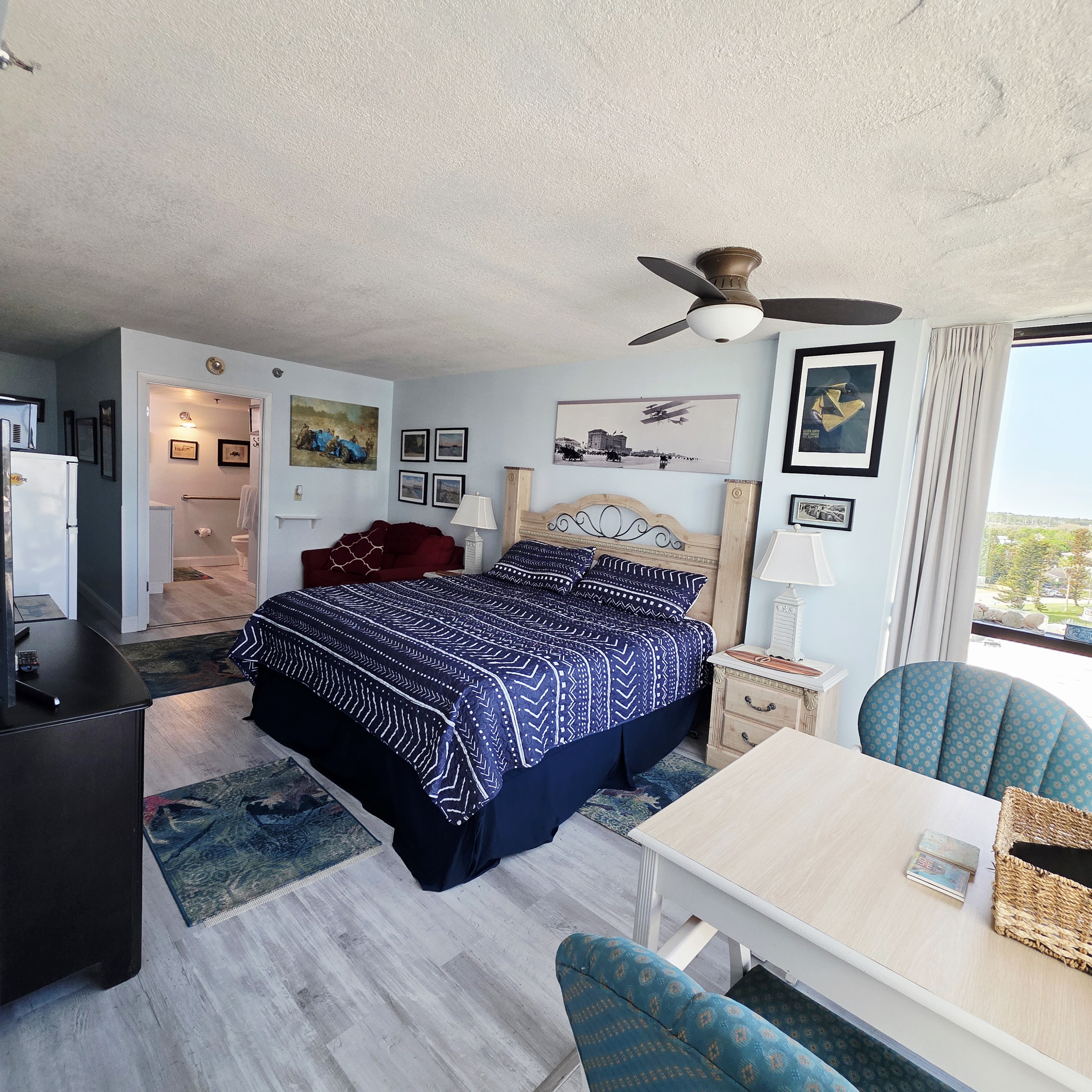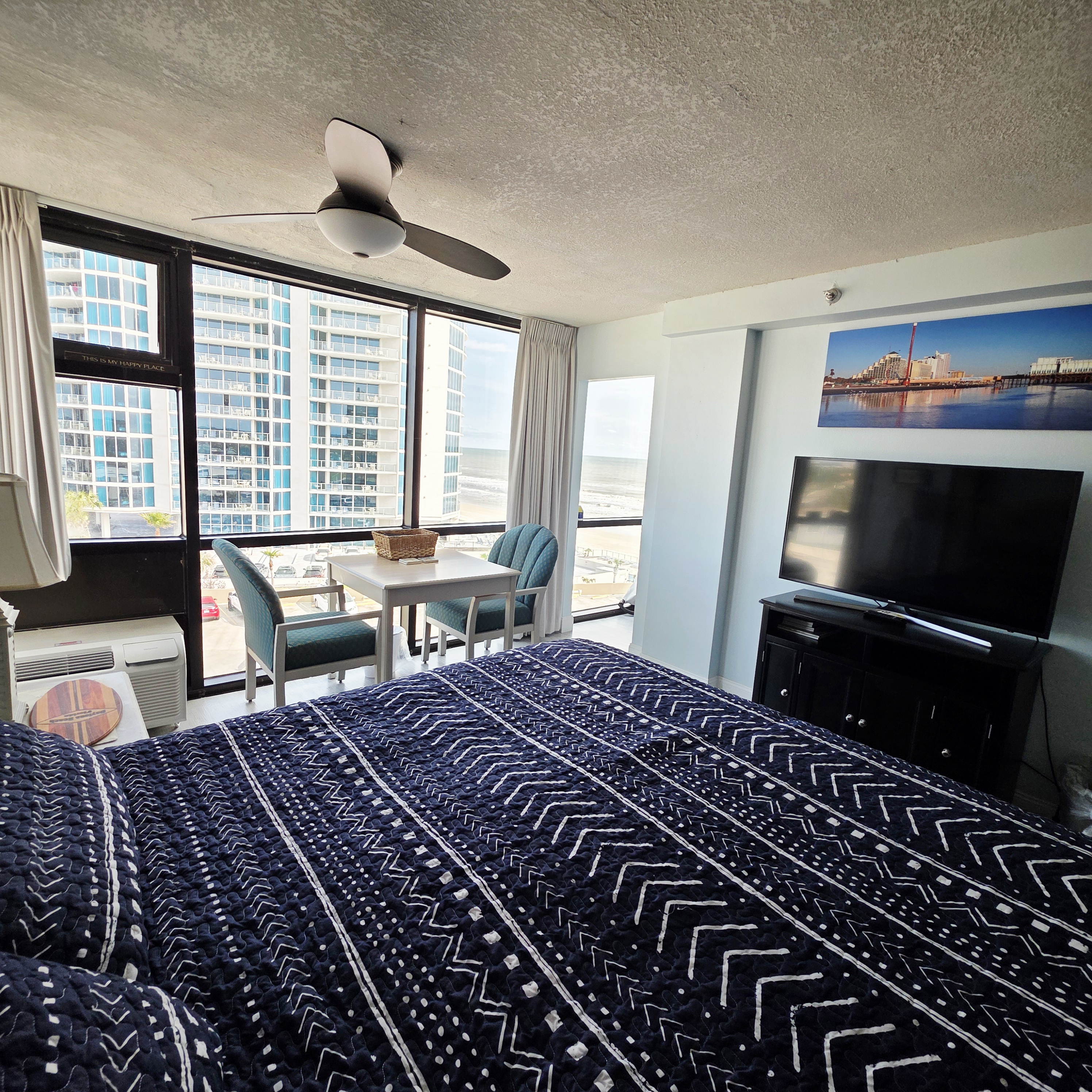 Comfy King bed with views of the ocean! Mini fridge, microwave and coffee maker to have leftovers, make morning coffee and sit and watch the waves roll in. Updated bathroom with handicap accessible shower. Completely renovated unit with wood plank floors!