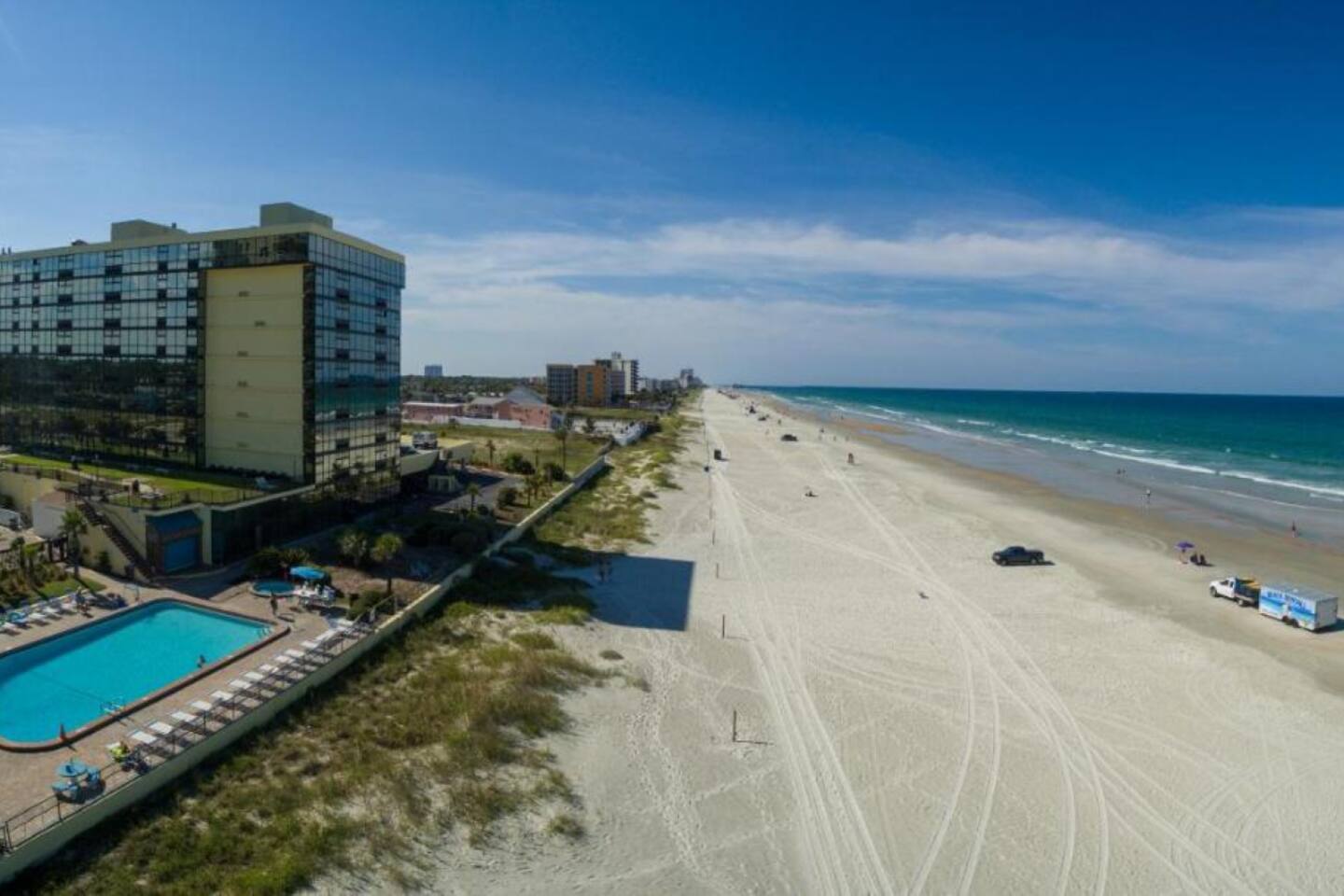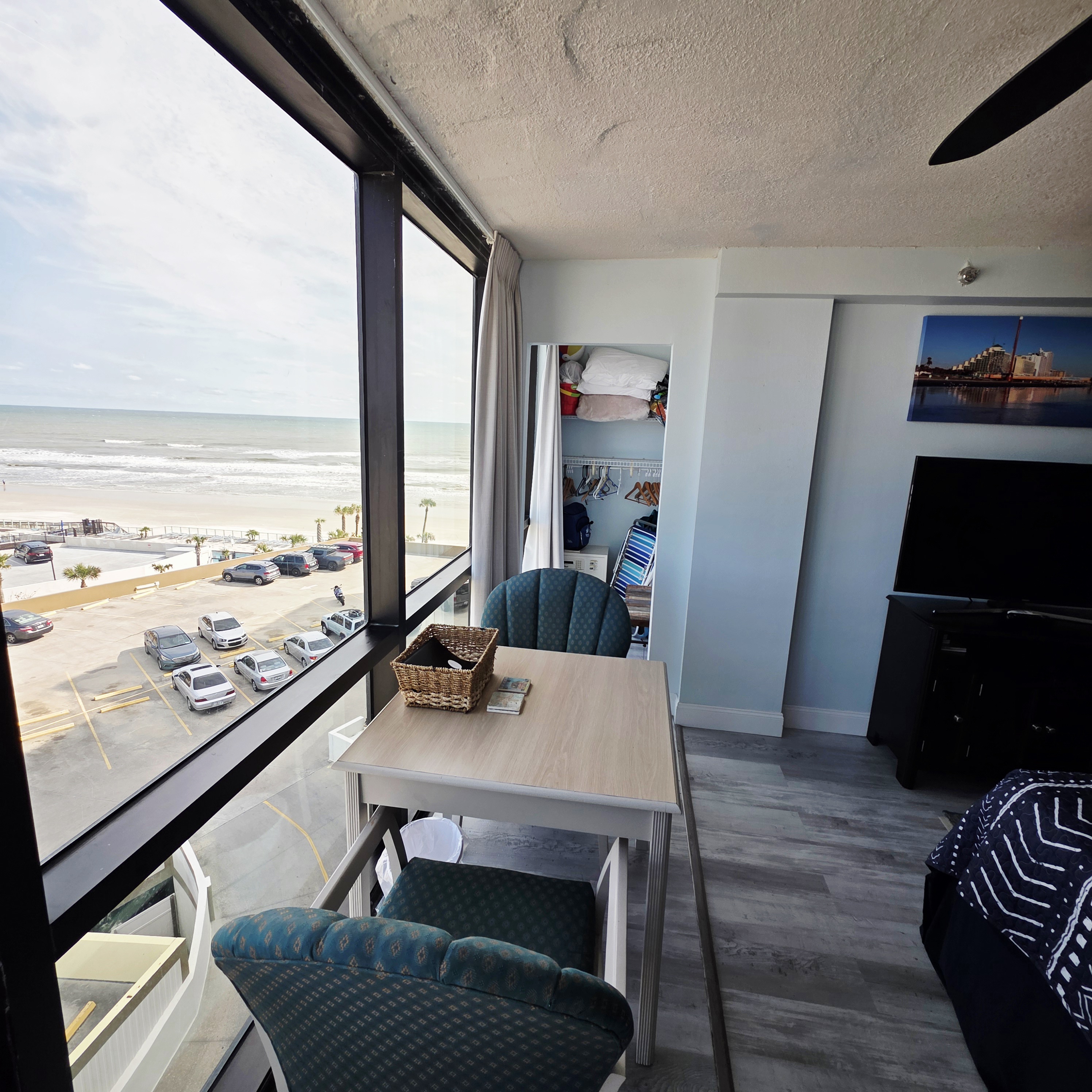 Experience the ultimate beachfront getaway with this cozy king oceanview studio! Perfect for a couple or individual. Enjoy stunning ocean views from floor to ceiling windows, relax by oceanside pool, sip a drink at the poolside tiki bar, & take advantage of direct access to sandy beach just steps away. Whether you're traveling as a couple or seeking along time, this unique setup combines convenience & seaside charm. Coffee maker, refrigerator & microwave available. 6 miles to Daytona Speedway