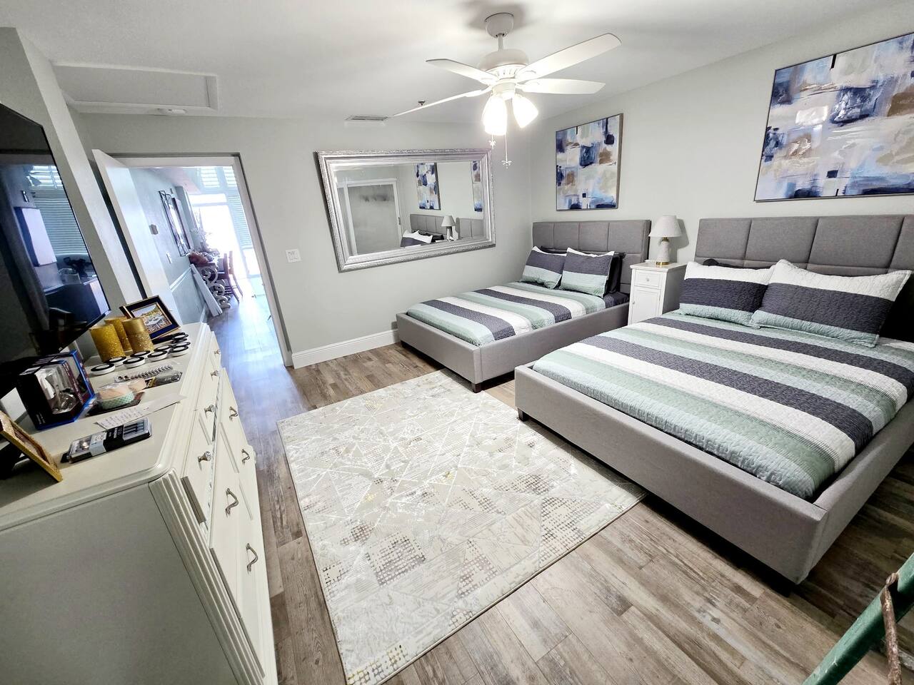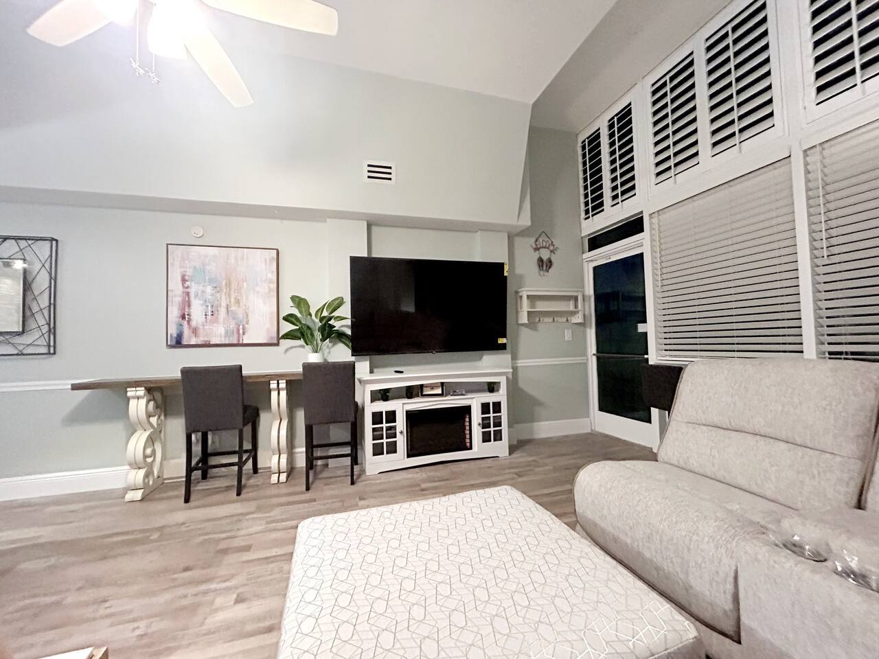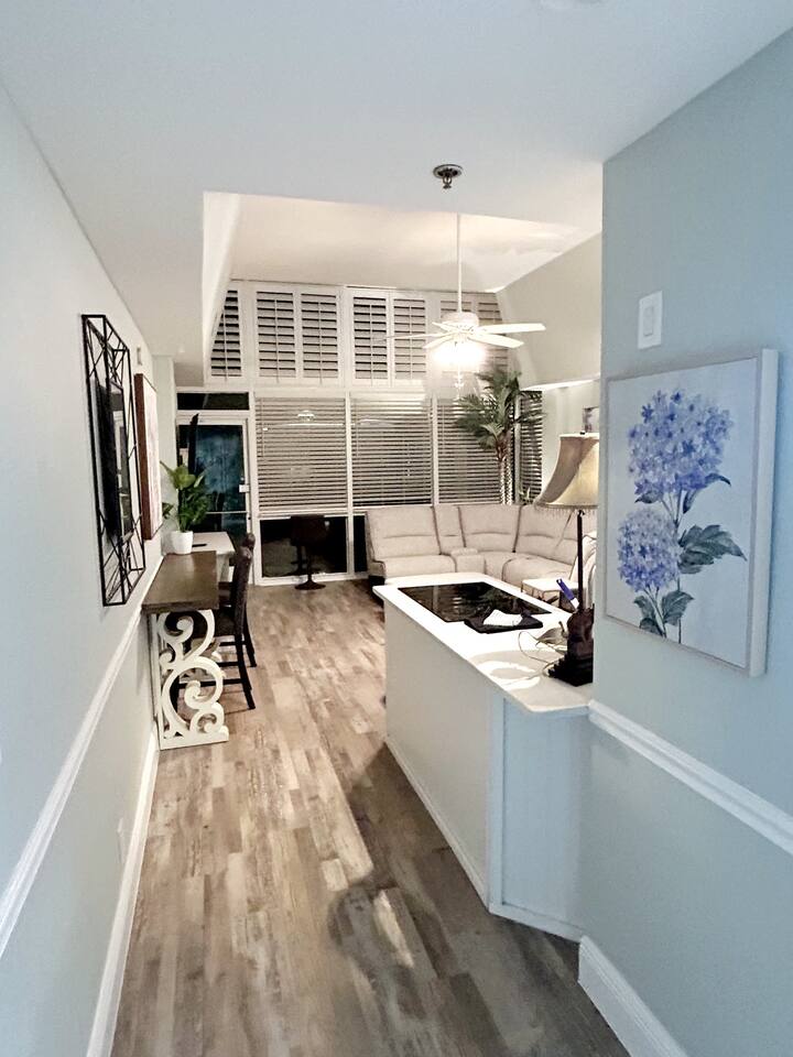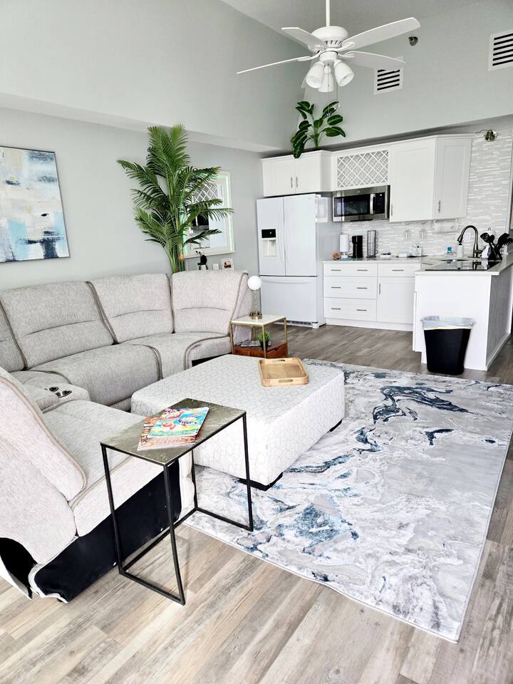 Lots of storage for longer term guests in the bedroom. Large Roku Tvs in both living room and bedroom. Fireplace cabinet in living room and beautiful sectional. 5 bar top chairs, 3 of which look out over the beach to sit and sip your coffee while watching the sun come up. Fully stocked kitchen with full sized fridge, microwave, pod type coffee maker, toaster, cooktop, and all necessary kitchen cookware and utensils. We supply some coffee, sugar and creamers to get you started, set of 4 bath towels sets, 4 beach towels. We also supply a few rolls of toilet paper, paper towels and garbage bags. We are located very close to a grocery store and Dollar General of any other additional items you may need or want.