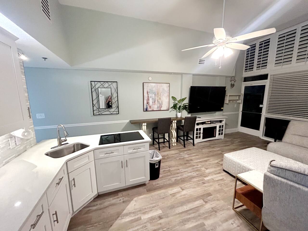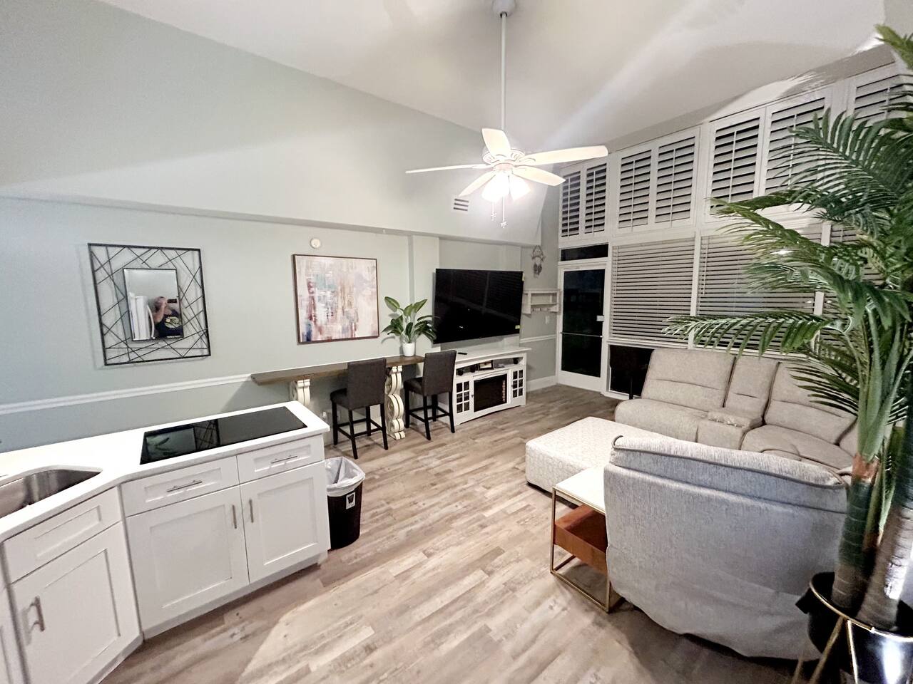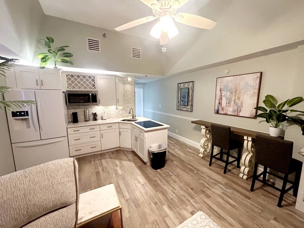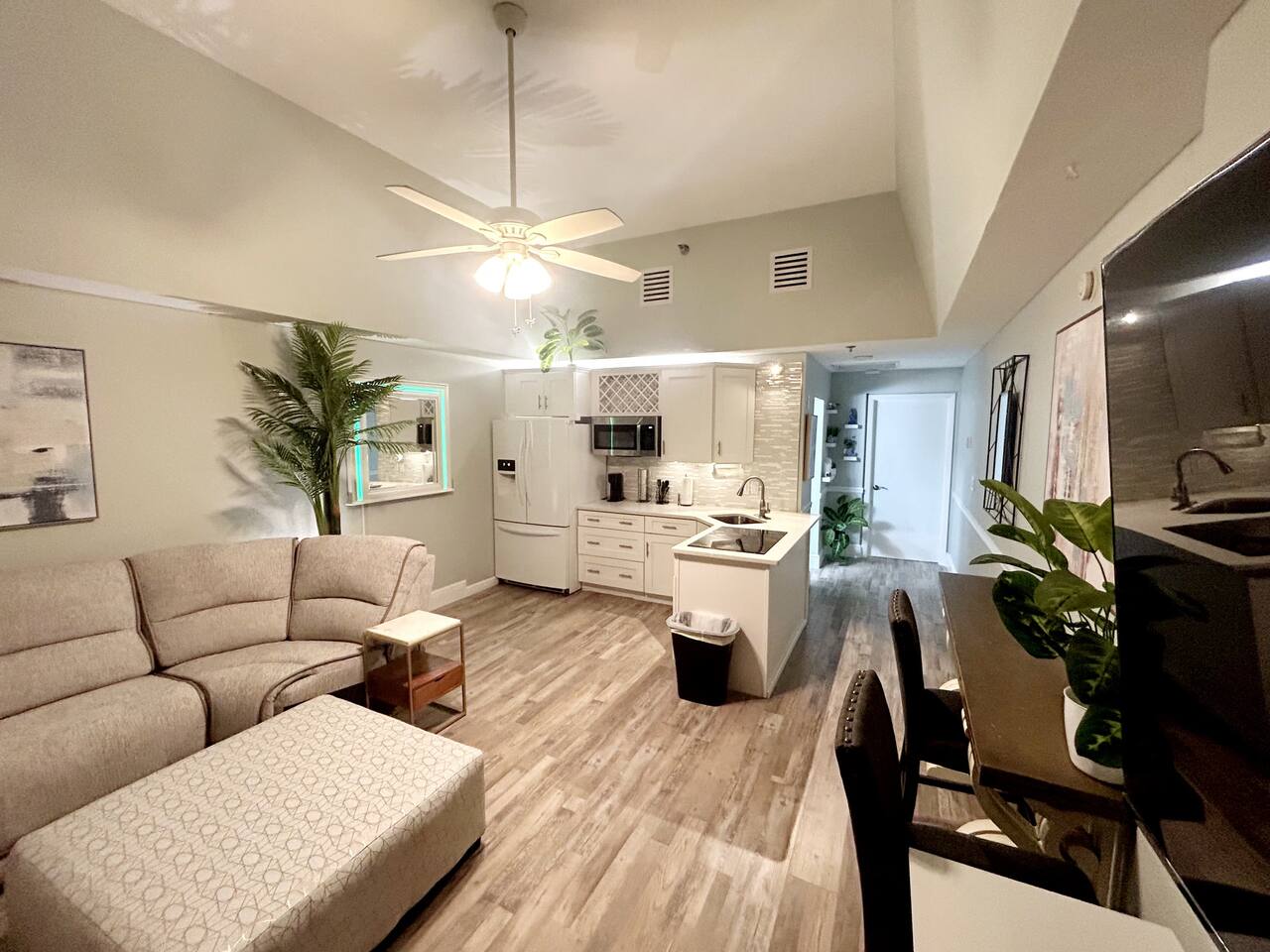 Lots of storage for longer term guests in the bedroom. Large Roku Tvs in both living room and bedroom. Fireplace cabinet in living room and beautiful sectional. 5 bar top chairs, 3 of which look out over the beach to sit and sip your coffee while watching the sun come up. Fully stocked kitchen with full sized fridge, microwave, pod type coffee maker, toaster, cooktop, and all necessary kitchen cookware and utensils. We supply some coffee, sugar and creamers to get you started, set of 4 bath towels sets, 4 beach towels. We also supply a few rolls of toilet paper, paper towels and garbage bags. We are located very close to a grocery store and Dollar General of any other additional items you may need or want.