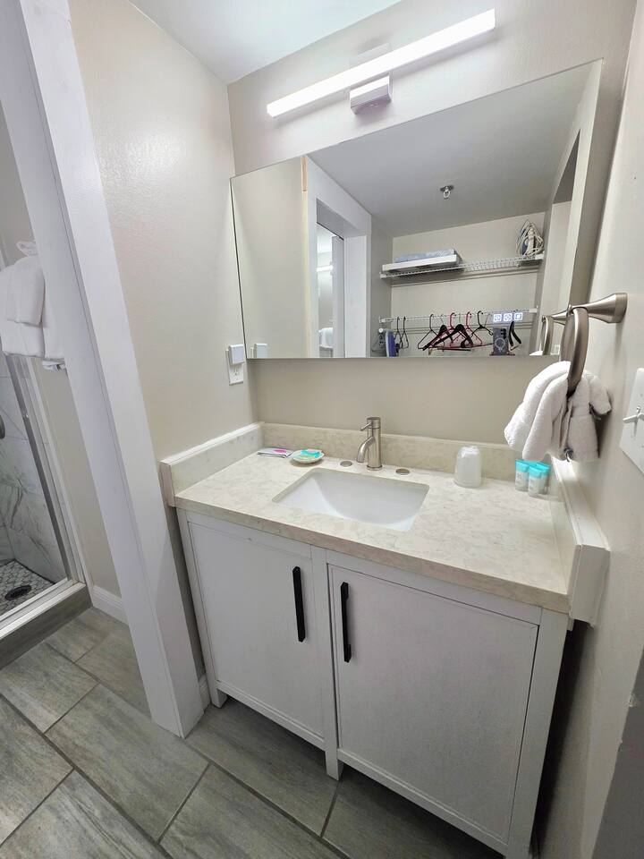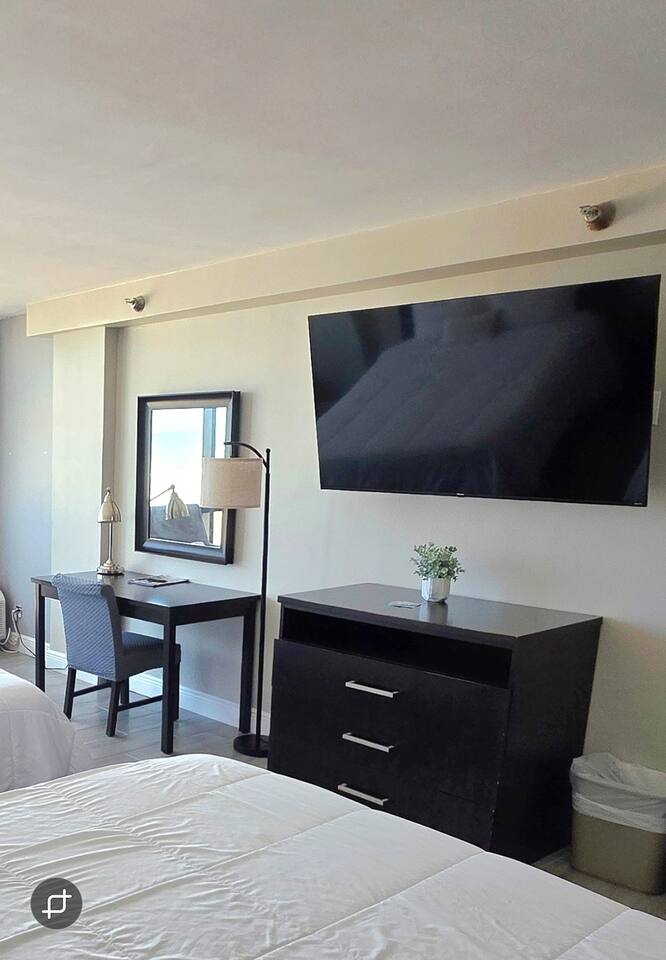 Open floor plan with floor to ceiling windows directly facing the Atlantic Ocean for beautiful morning sunrises. Enjoy the view with your favorite beverage in the comfort of A/C. Large smart TV with access to cable and streaming apps. Enjoy the convenience of preparing snacks in your own kitchen, or venture downstairs to our on-site Tiki Bar that has delicious food and drinks! We supply all cooking necessities, dishware, full sized fridge. Also, we supply all linens including beach towels so you just need to bring your bathing suit!