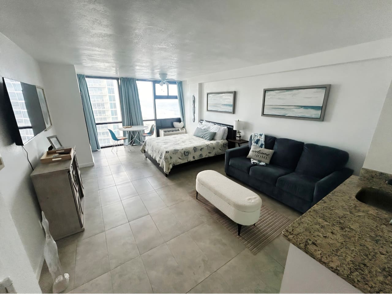 Escape to a dreamy coastal retreat in this oceanview queen studio w/queen sleeper—perfect for couples looking to reconnect & relax, or bring the kiddos. Ocean views, beach access, & poolside tiki bar Studio includes: Plush queen bed & queen sleeper sofa Convenient kitchenette w/ mini-fridge, microwave, coffee maker, & basic utensils Sparkling outdoor pool ideal for lounging Tiki bar offering tropical drinks & great food Easy beach access for romantic walks on the shore. 6 miles to Speedway