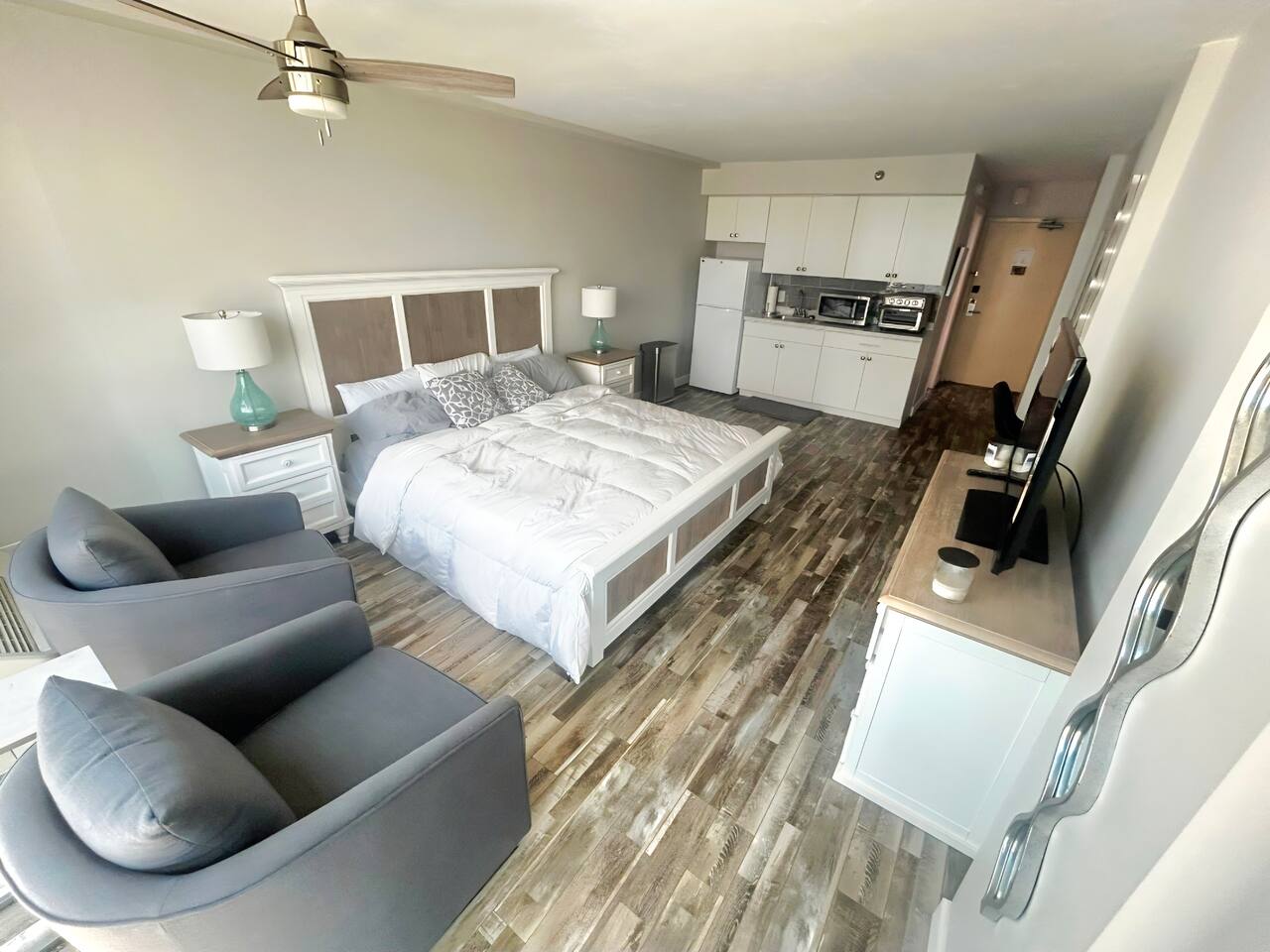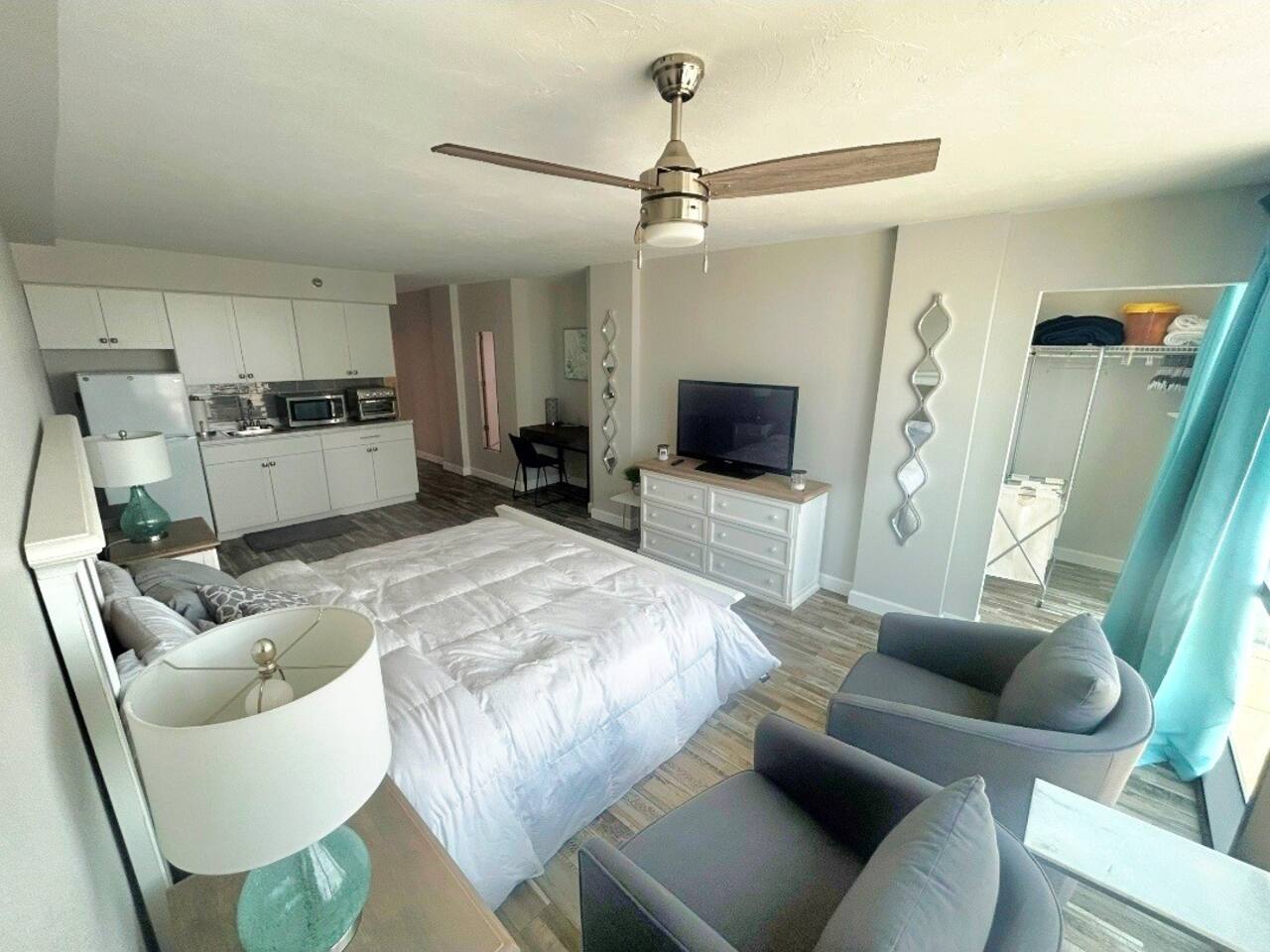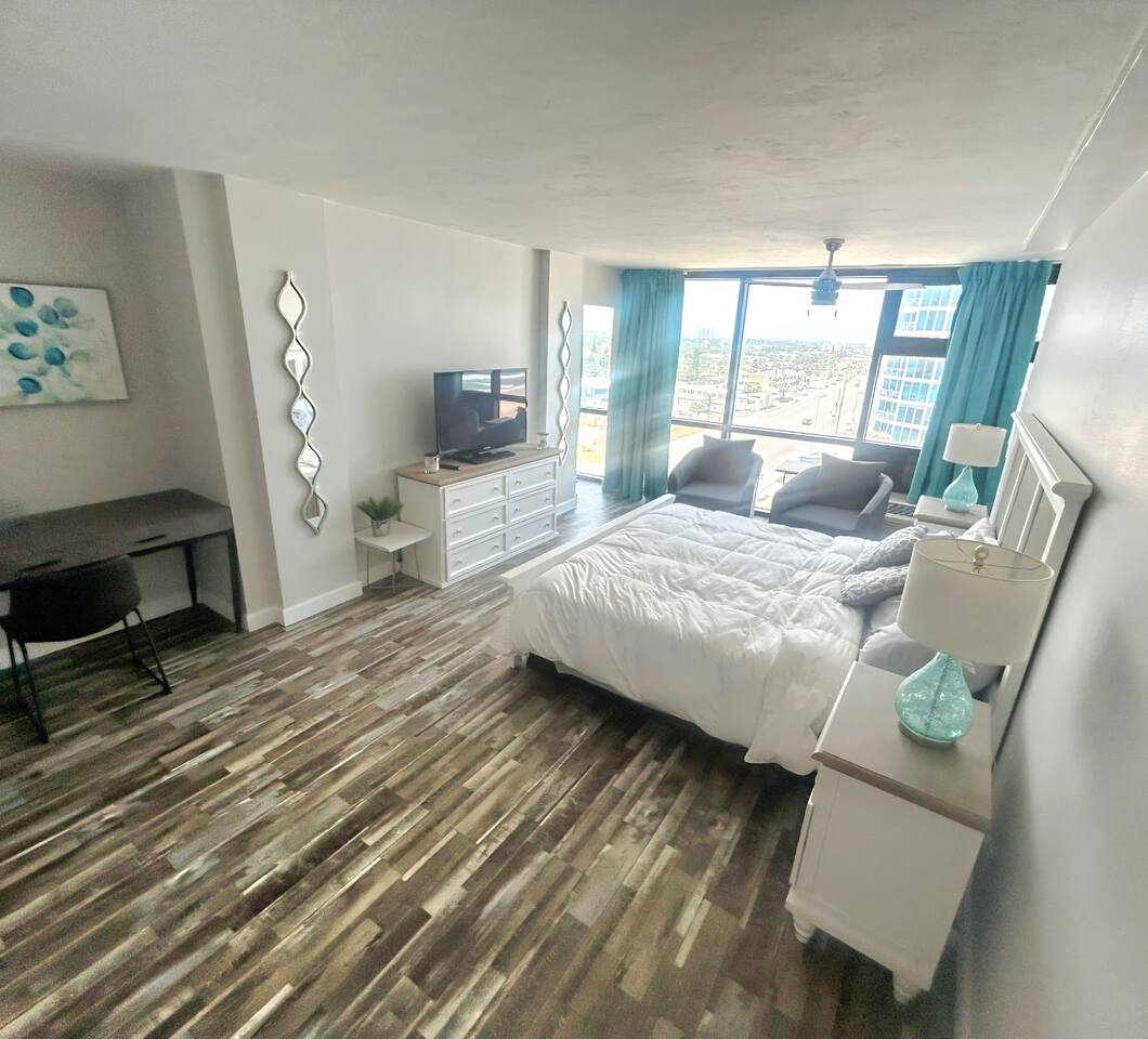 Escape to a dreamy coastal retreat in this romantic oceanview king studio—perfect for couples looking to reconnect and relax. Wake up to panoramic ocean views, enjoy quiet mornings on your private balcony, and end each day with a toast under the stars at the poolside Tiki Bar. Whether you’re celebrating a honeymoon, anniversary, or just need a weekend to yourselves, this peaceful, stylish space is your perfect coastal hideaway.