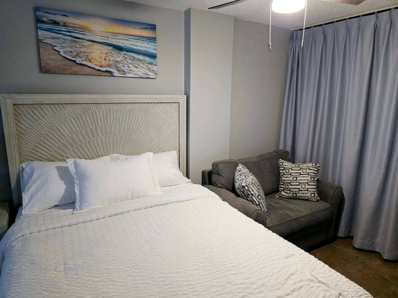 Soak in breathtaking ocean views from this king studio, perfect for a relaxing coastal getaway. Located directly on the beach, this bright & airy space features a plush king-size bed & twin sleeper w/ ocean views from floor to ceiling windows. The kitchenette has what you need for prepping light meals & snacks. Kick back and relax in this calm, stylish space. Ideal for couples or solo travelers looking to unwind. Located 6 miles from Daytona's Int'l Speedway and Airport. 2 miles to Boardwalk.